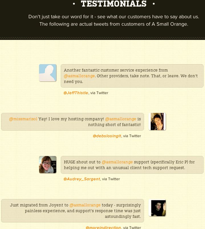 Take customer testimonials. Do you really believe them? Like me, you likely skip right over them and hunt the web for real reviews. As Bodnar pointed out, check out how A Small Orange is reinventing customer testimonials. They simply favorite tweets on Twitter, in which their own customers publicly praise their work, and embed the tweets directly on their site.